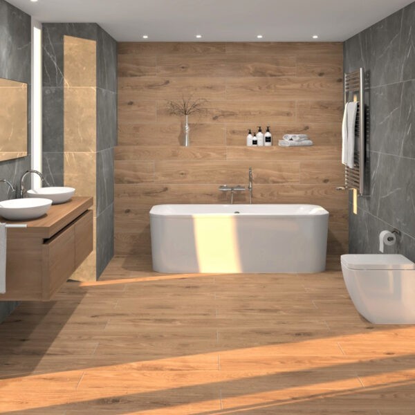 Deze houtlook vloertegels zijn uitermate geschikt voor het populaire visgraat motief.